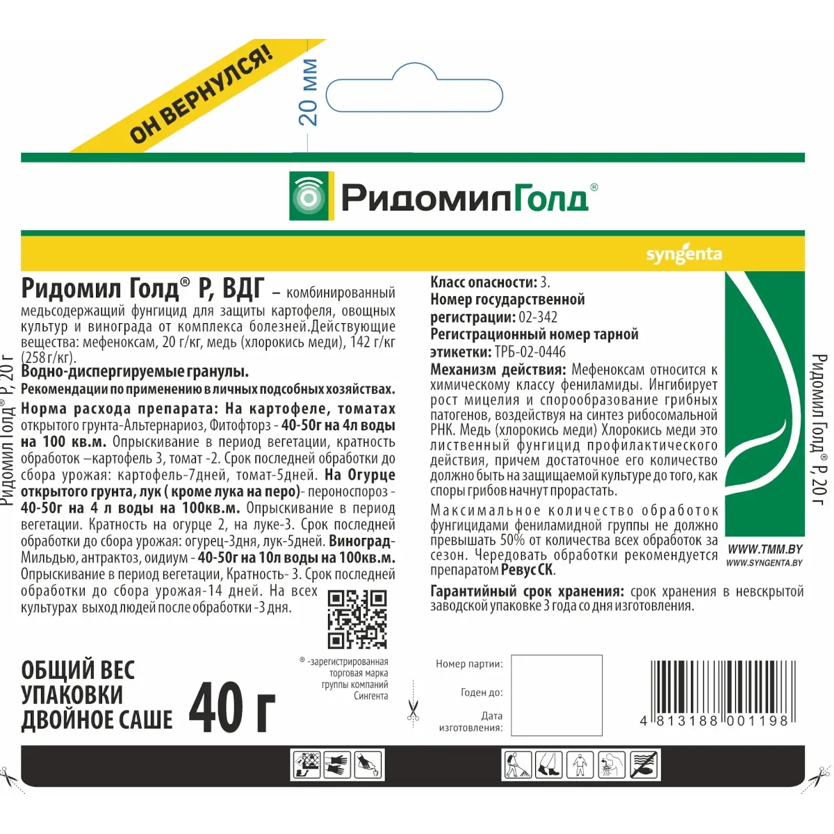 РИДОМИЛ® Голд Р, ВДГ эффективно защищает картофель и овощные культуры от фитофтороза и альтернариоза, лук от пероноспороза, виноград от милдью, антракноза, черной пятнистости, а также предотвращает распространение бактериозов на всех культурах.