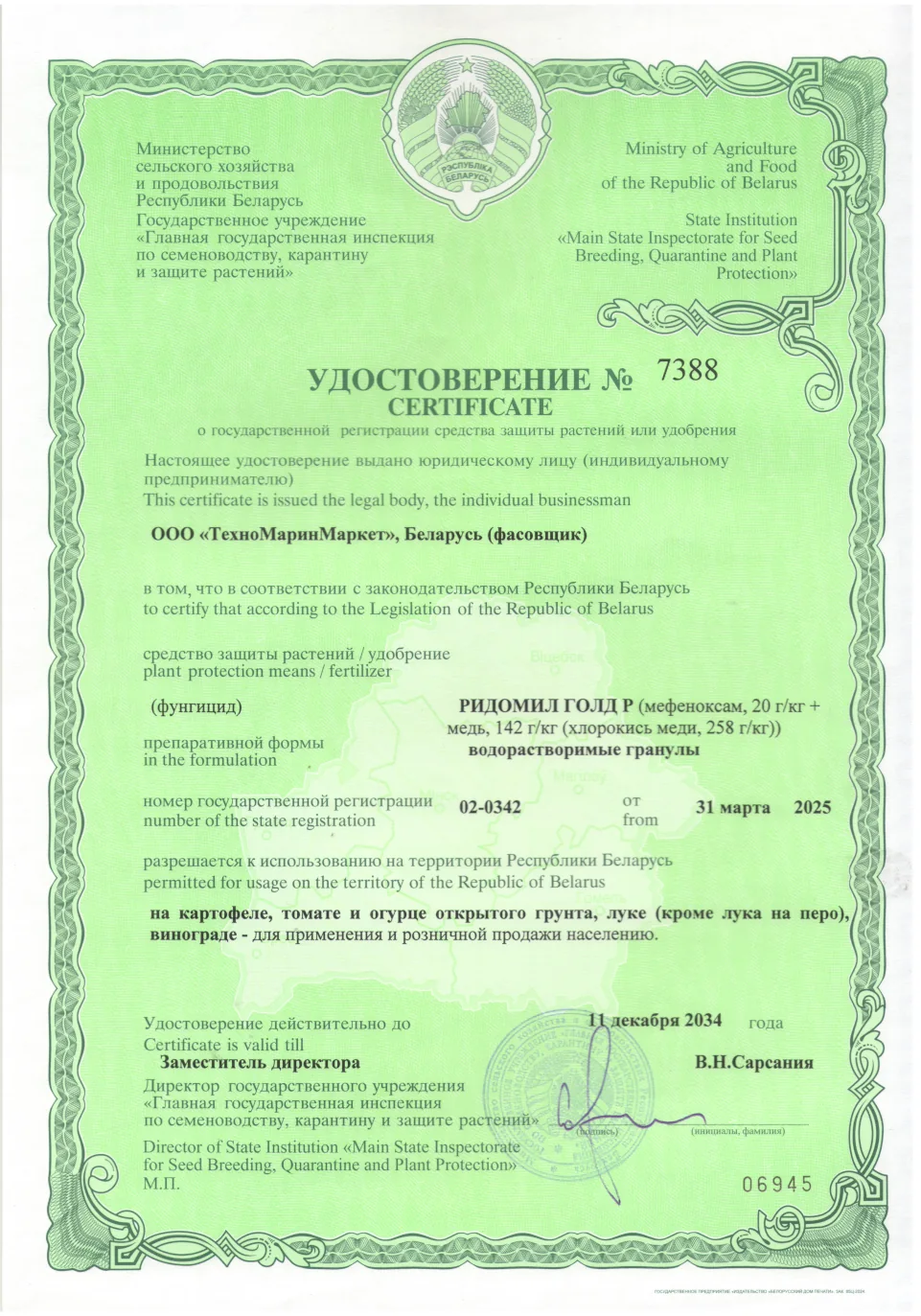 | Назначение | Комбинированный медьсодержащий фунгицид для защиты картофеля, овощных культур и винограда от комплекса болезней |